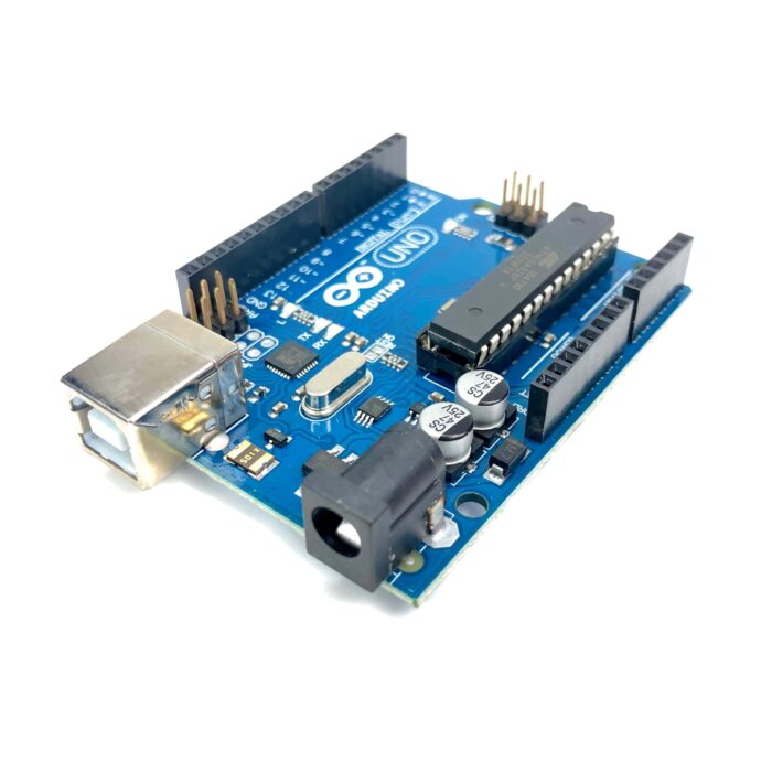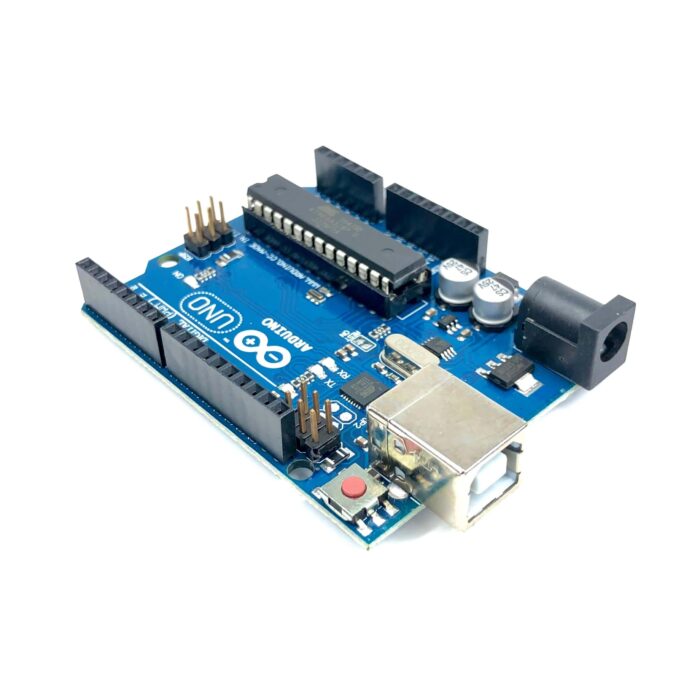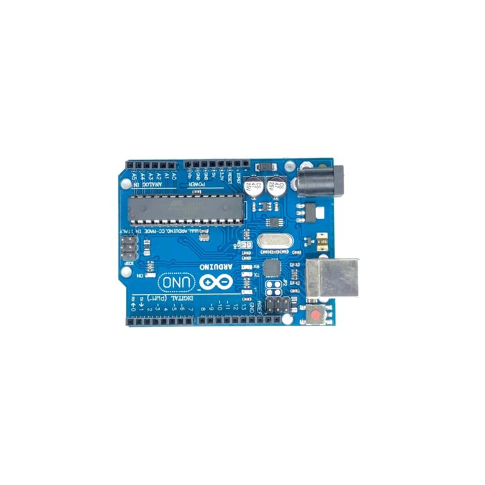 Arduino UNO R3 ATmega328P development board. Comes with 14 digital I/O pins, 6 analog inputs, USB connection, power jack, and ICSP header.