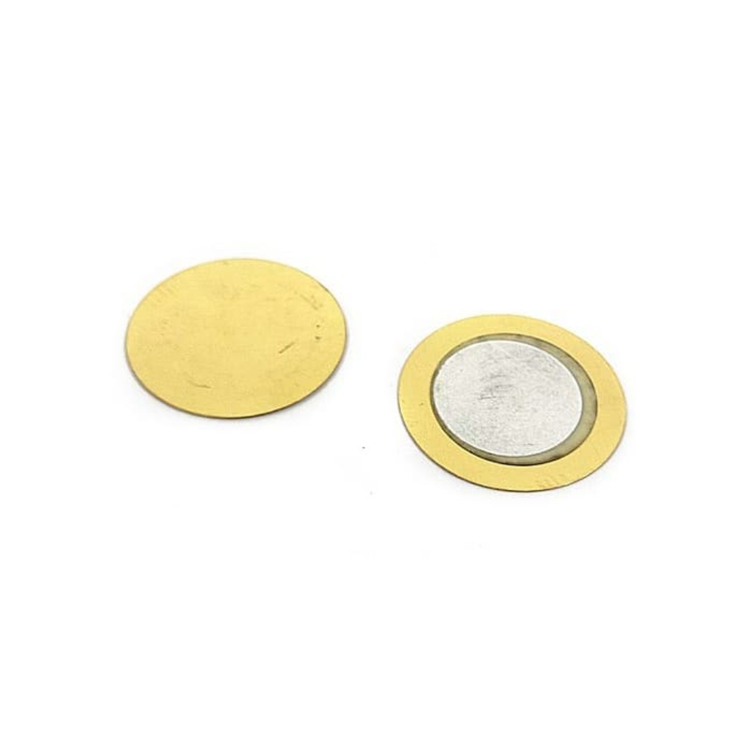 Versatile brass + piezoelectric ceramic plate that generates voltage on impact; great for touch switches, knock sensors, and DIY sound pickups.